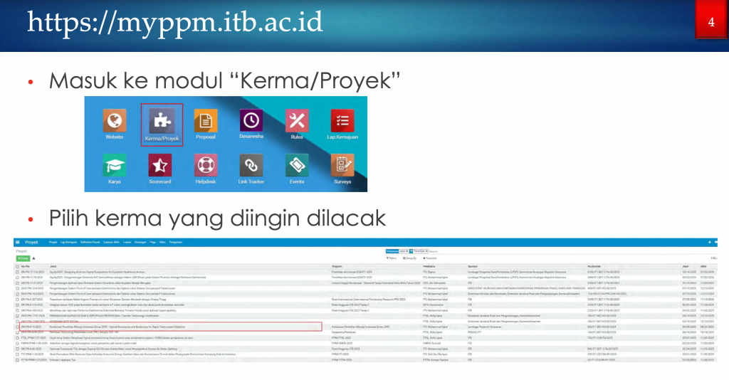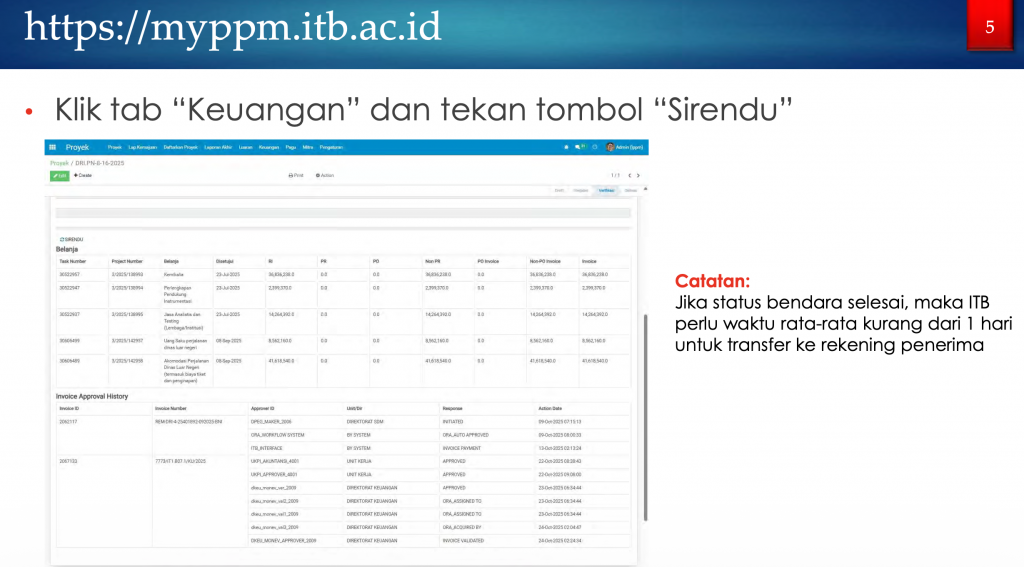1. Untuk peneliti dan pengabdi masyarakat, ada myPPM di myppm.itb.ac.id. Di sini, Anda bisa masuk ke modul “Kerma/Proyek”, pilih proyek yang ingin dilacak, lalu klik tab “Keuangan” dan tekan tombol “Sirendu”. Sederhana. Langsung. Real-time. Ada informasi menarik di sini: ketika status bendara sudah selesai, ITB rata-rata butuh kurang dari 1 hari untuk transfer ke rekening. Jadi, kalau status sudah “selesai” tapi dana belum masuk dalam 24 jam, barulah waktunya menghubungi Direktorat Keuangan.