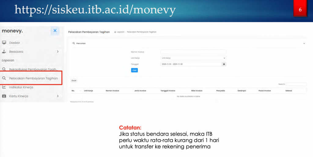 2. Untuk pembayaran non-kerma, WDS (Wakil Dekan Sumber Daya) fakultas bisa mengakses sistem monitoring dan evaluasi di siskeu.itb.ac.id/monevy. Login dengan SSO ITB, pilih menu “Pelacakan Pembayaran Tagihan“, dan semua informasi ajuan pembayaran fakultas ada di sana. Untuk itu, yang diperlukan adalah nomor invoice.