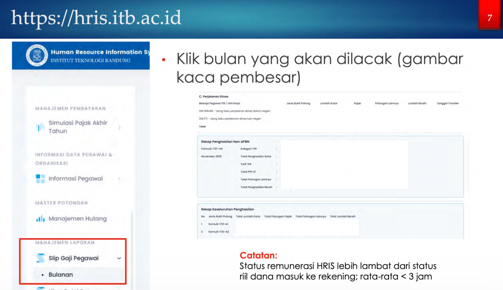 3. Untuk remunerasi, setiap civitas ITB bisa mengecek sendiri melalui HRIS di hris.itb.ac.id. Masuk ke menu “Slip Gaji Pegawai“, pilih “Bulanan“, lalu klik ikon kaca pembesar di bulan yang ingin dilihat.