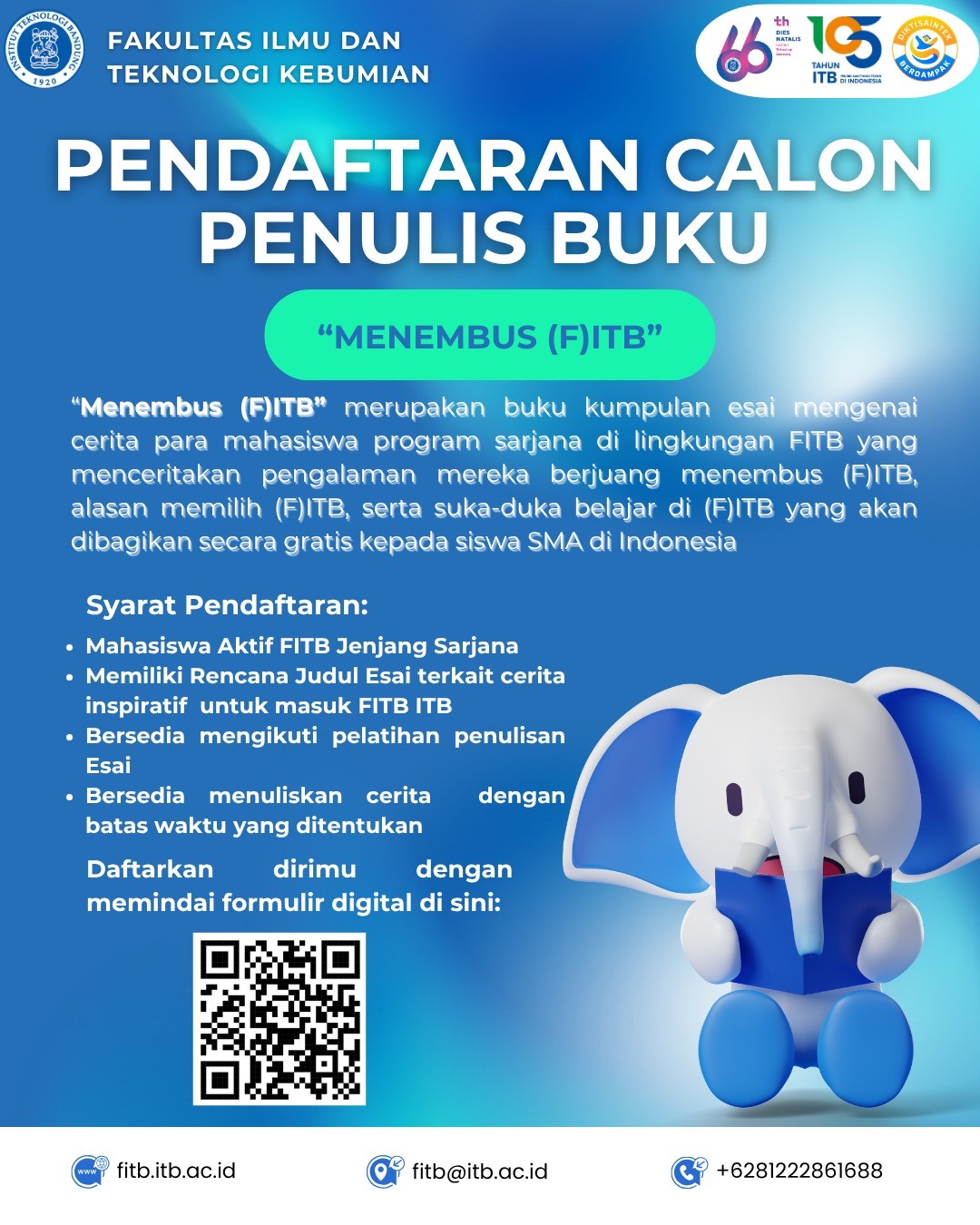 Fakultas Ilmu dan Teknologi Kebumian mengundang para mahasiswa aktif FITB jenjang Sarjana untuk menjadi penulis dalam Buku Kumpula Esai “Menembus (F)ITB” 🌟 Setiap mahasiswa FITB punya cerita. Tentang mimpi yang dikejar, tantangan yang dihadapi, dan alasan mengapa akhirnya memilih FITB. Kini, saatnya kamu membagikan kisah itu! 📖 Menembus (F)ITB adalah buku kumpulan esai mahasiswa FITB […]