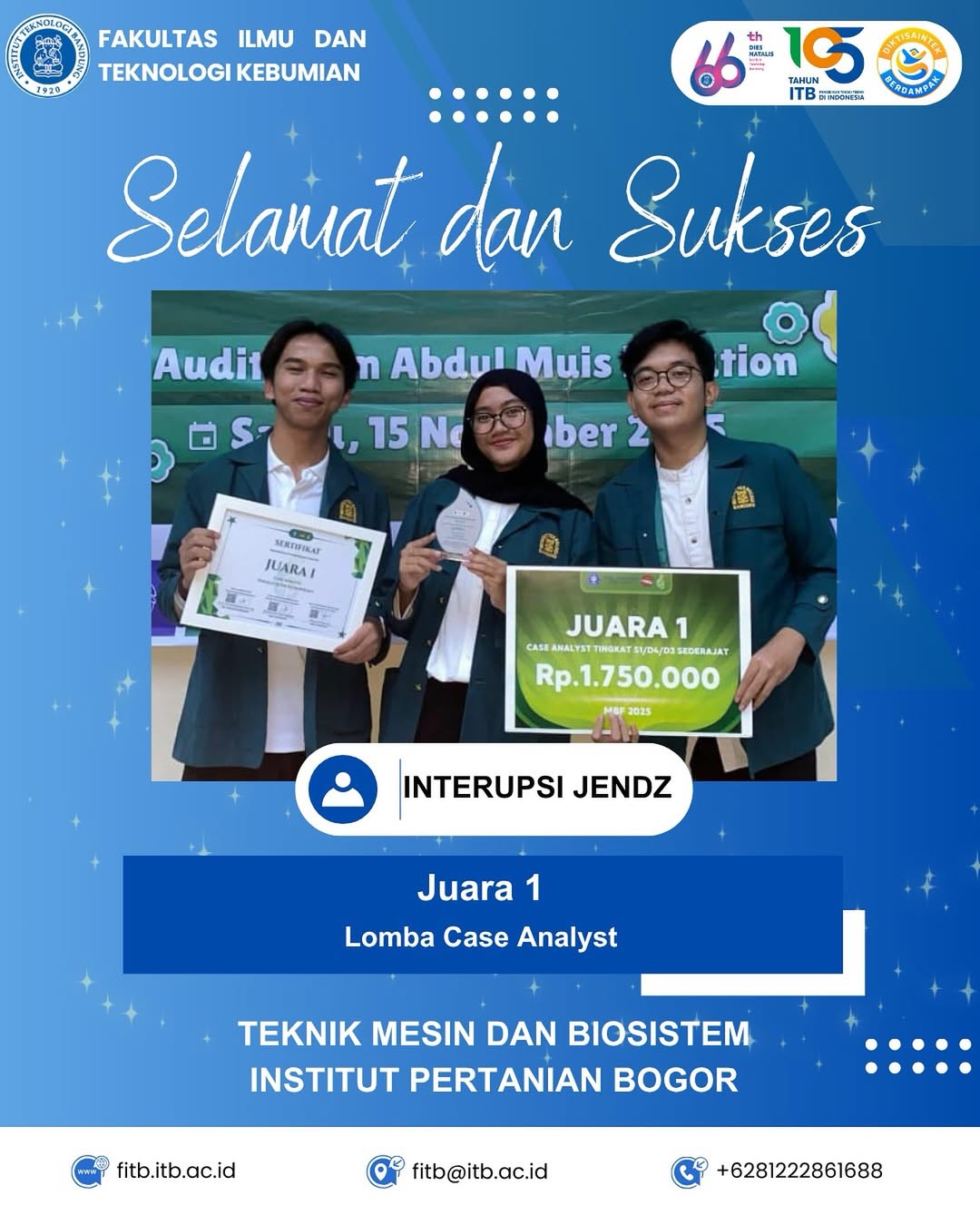 Fakultas Ilmu dan Teknologi Kebumian mengucapkan selamat kepada tim Gajah Tani: 1. Rayhan Pratama – Teknik Geologi – 12024081 2. Naurah Marcella Rezwan – Teknik Kimia – 13024103 3. Naomi Azzahra – Sistem dan Teknologi Informasi – 18224017 Yang telah mendapatkan Juara 2 dalam Lomba Karya Tulis Ilmiah Nasional yang diselenggarakan oleh Himpunan Mahasiswa Kimia […]