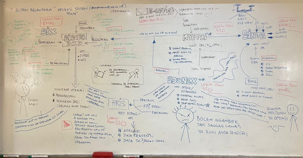 Selamat datang di dunia akademik ITB, tempat ide-ide besar lahir—dan juga tempat Anda harus berhadapan dengan labirin sistem informasi yang akrab disebut “Hutan Belantara”. Diagram ini menggambarkan secara jenaka namun detail kompleksitas sistem administrasi dan akademik dosen di ITB (Institut Teknologi Bandung) yang sering dijuluki “Hutan Belantara”.
