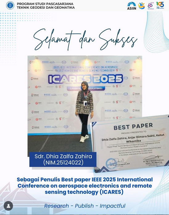 Atas keberhasilannya Best paper IEEE 2025 International Conference on aerospace electronics and remote sensing technology (ICARES) dengan paper yang berjudul “Spatio-temporal Analysis of Forest Degradation and its Biomass Carbon Model in Sumatra”